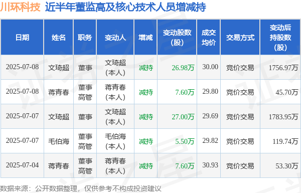 川环科技近半年内的董监高及核心技术人员增减持详情如下: